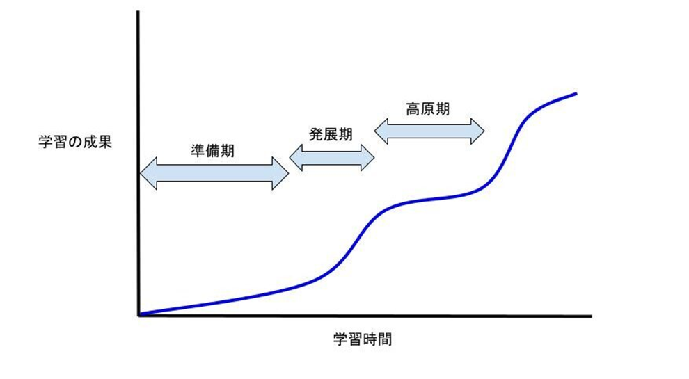 中でも、多くの人が陥りやすいのは、3ステージ目のプラトー(高原期)現象です。初めてのことに挑戦(準備期)するときは、覚えることの大変さよりも新しいことを習得していくことの楽しさが上回ります。やがて、理解が進み、できることが多くなっていくと(発展期)、その面白さ・楽しさは倍増します。