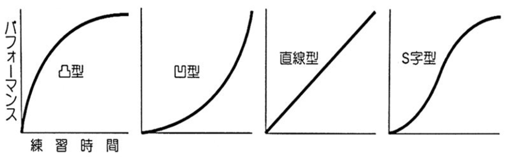 先のエビングハウスの学習曲線は、一般的な学習理解の型を示していますが、他の学習理論や私の経験上から、子供の学びの曲線は4種類あると考えています。理解度が早く、急激な伸びを示す凸型タイプ。理解するまでは少し時間がかかるが、ある時期から急激に伸びていく凹型タイプ。理解も伸びも一定で、理解が順調に進む直線型タイプ。そして、エビングハウスの学習曲線に少し似ていますが、伸びと停滞を繰り返しながら理解が進んでいくS字型タイプです。まずは、指導者は子どもがどのタイプか、見極めていくことが必要でしょう。